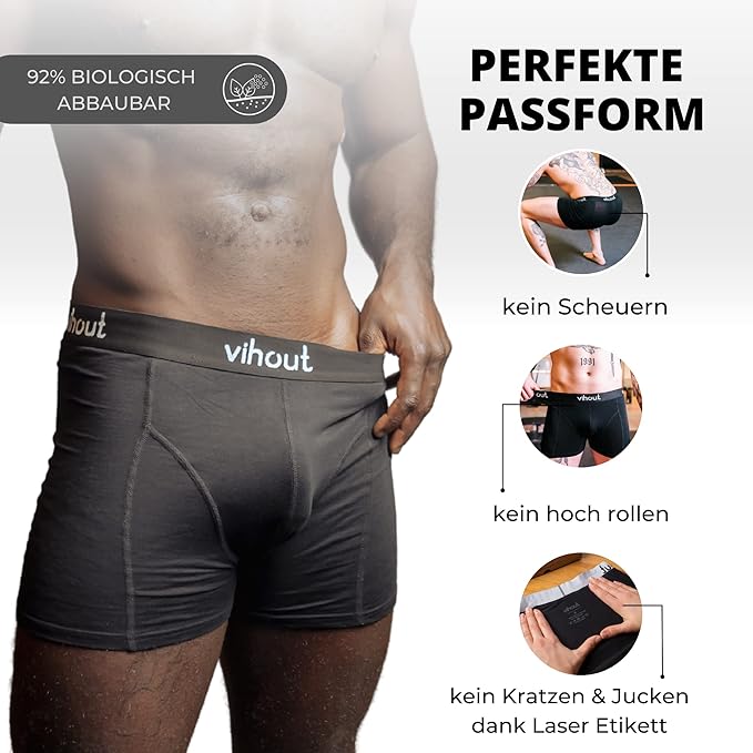 Vihout setzt auf Micro Modal, eine Naturfaser, die von Natur aus antibakteriell, hautfreundlich und ultraweich ist. Kein Jucken, kein Kratzen: Das Laser-Druck-Etikett ersetzt störende Plastikschilder. Dadurch fühlt sich die Unterwäsche nicht nur besser an, sondern ist auch hygienischer und langlebiger. Perfekt für empfindliche Haut und für alle, die kompromisslosen Tragekomfort erwarten.